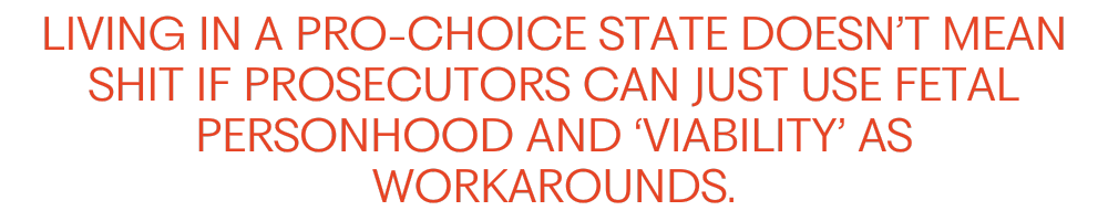 And that’s the thing: When pro-choice states have legal ‘viability’ limits, they are still endorsing restrictions and fetal personhood—just on a different timeline! And when you create that line at all, you’re opening the door for zealous police officers and prosecutors to use it as an excuse to target the most marginalized—like young people.