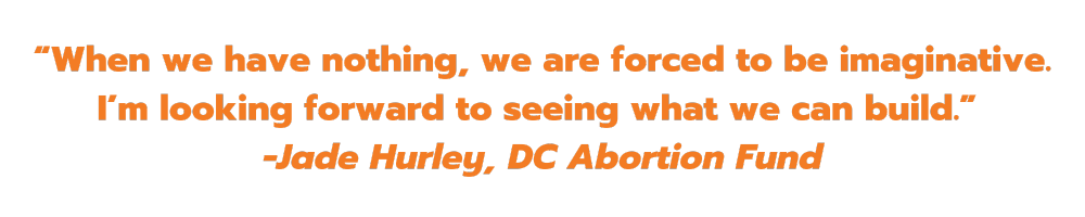 Jade Hurley, the communications manager behind the DC Abortion Fund, described to the Huffington Post our current moment where the abortion rights movement has become unapologetic along with a future that provides protections beyond the lines Roe drew in the sand. “When we have nothing, we are forced to be imaginative,” she said. “I’m looking forward to seeing what we can build.”