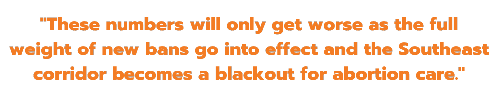 Reports from 538 and #WeCount also analyzed what the shifts in these numbers meant for the rest of the country, as even pro-choice states reeled from the aftershock of the trigger bans and subsequent legislation. They noted that several states in the Southeast—North Carolina, South Carolina, and Florida—saw some of the largest initial surges in patients after the Dobbs decision and were vital access points for those forced to travel for abortion care. We know that these numbers will only get worse as the full weight of new bans go into effect and the Southeast corridor becomes a blackout for abortion care.