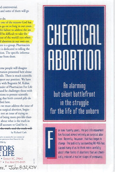 But here’s the thing: Abortion, Every Day has learned that Cash once wrote an entire pamphlet calling oral contraceptives “chemical abortion.” In it, he claimed that “all forms of the birth control pill” kill a “human being.”