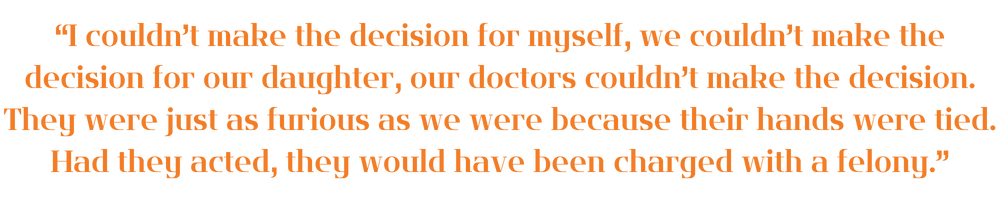 “I couldn’t make the decision for myself, we couldn’t make the decision for our daughter, our doctors couldn’t make the decision. They were just as furious as we were because their hands were tied. Had they acted, they would have been charged with a felony. Being told you are going to lose your baby, and you just have to live with it for several days, and there’s nothing we can do, I was left, wanting either to get so sick that my life is at risk or that my baby’s heart stopped beating so it could be over.”