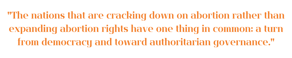 While most of the rest of the world is moving toward broader respect for human rights, including women’s rights, and expanding abortion alongside a greater embrace of democratic norms, the US is in league with only a tiny handful of nations in making abortions harder to get, and in newly criminalizing them. The nations that are cracking down on abortion rather than expanding abortion rights have one thing in common: a turn from democracy and toward authoritarian governance.