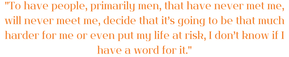 “There are so many layers of emotional pain involved with losing a pregnancy. To have people, primarily men, that have never met me, will never meet me, decide that it’s going to be that much harder for me or even put my life at risk, I don’t know if I have a word for it.”