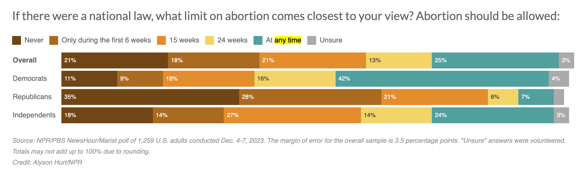 I want to talk about this Marist poll looking at how Americans’ views align with those of Republican presidential candidates. The results on abortion are really, really interesting. Namely, when voters were asked what kinds of restrictions they’d support if there was a national abortion law, the most popular answer was NONE.