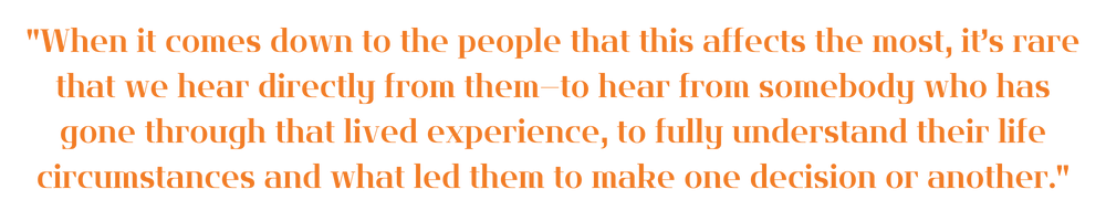 “[W]hen it comes down to the people that this affects the most, it’s rare that we hear directly from them—to hear from somebody who has gone through that lived experience, to fully understand their life circumstances and what led them to make one decision or another, and to really hear from them about the emotions behind their decision, like the pain, the judgment that they may have faced. I think that part of it can get lost when we focus on just the loudest voices in the room.”