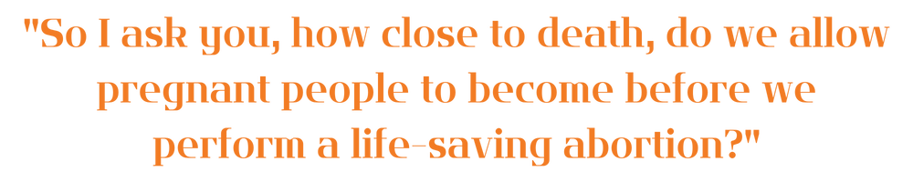 “Because of the 15-week ban, she was forced to come to the office every day, as she waited in agony for the cardiac activity to stop or for her to develop signs of infection before the hospital would agree to end her pregnancy. By the end of the week, neither fetus had a heartbeat and doctors were finally permitted to end her pregnancy and prevent her from going into deadly septic shock.”