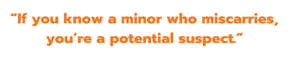 Coffield also said (and this made my blood run cold), “If you know a minor who miscarries, you’re a potential suspect.”
