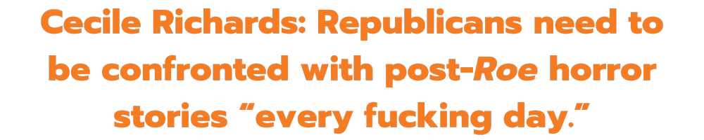 “Richards thinks Republicans should be asked constantly about the women in ban states who have been forced to bleed out or suffered sepsis because they couldn’t get emergency abortions. ‘We hear a tragic story, or another woman becomes a plaintiff in Texas, and then we move on. It has got to be repetition every fucking day because there is no answer,’ Richards says furiously. ‘And look at the Republicans. They are running and hiding on this issue.’”