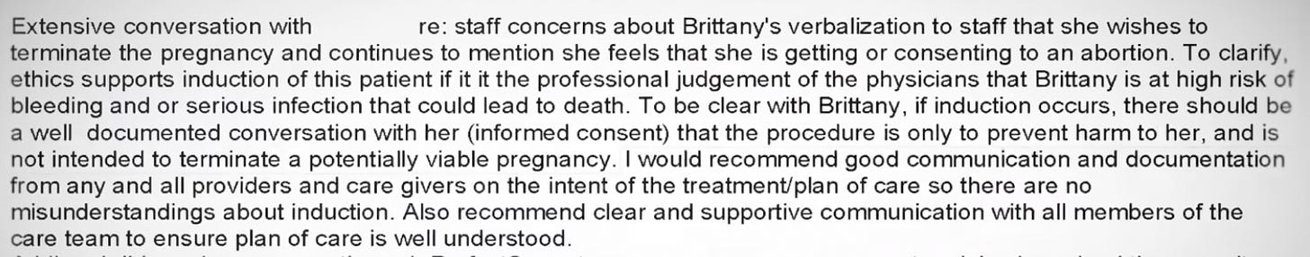 But the staff didn’t like that. They wrote that “ethics supports induction of this patient” if doctors decided she was high risk. (Emphasis mine) They also wrote that if they do perform an “induction,” there should be a conversation with Brittany that the procedure “is not intended to terminate a potentially viable pregnancy.”