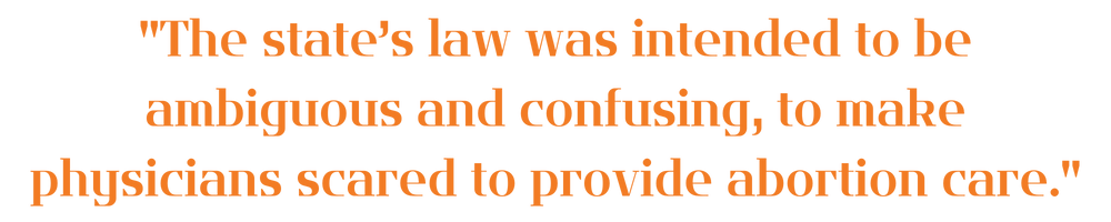 “I believe the state’s law was intended to be ambiguous and confusing, to make physicians scared to provide abortion care. We’re incentivized to pause, wait, reconsider — actions that can be life threatening. Women with ectopic pregnancies have waited in emergency rooms for hospital lawyers to determine whether an abortion can proceed. We have denied abortion care to women with cancer and other complex medical problems who find out they are pregnant. Women with pregnancies affected by life-limiting fetal anomalies — anencephaly (no skull or brain), renal agenesis (no kidneys, no proper lung development) — have had to seek abortion care out of state. One patient I managed who was unable to receive abortion care ultimately required an emergency hysterectomy and delivered an extremely premature infant, 14 weeks early.”