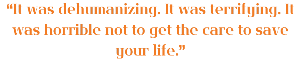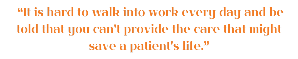 “It is hard to walk into work every day and be told that you can't provide the care that might save a patient's life. There's tremendous moral injury with being put in that situation, to be asked to care for people and not allowed to do the right thing.”