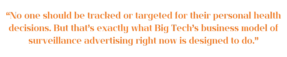 Policy manager Aditi Ramesh, “No one should be tracked or targeted for their personal health decisions. But that’s exactly what Big Tech’s business model of surveillance advertising right now is designed to do.”