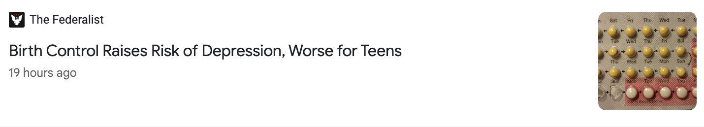 And of course, all of this policy work comes at the same time that conservatives are sowing cultural distrust in birth control as well. Right-wing publications are on the war-path against hormonal contraception, claiming that it hurts women. (Conservatives have even launched entire publications dedicated to that message!) Take this latest piece from the Federalist—which changed its original headline (below) after realizing they were probably being too explicitly creepy by highlighting how teenagers shouldn’t take contraception.