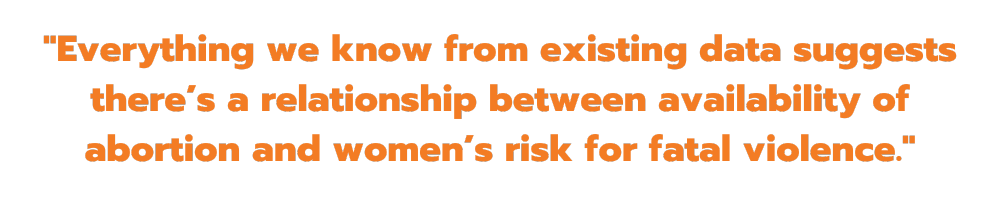 We know from research like the the Turnaway Study that denying women abortions put them at increased risk of violence—and that women who aren’t able to end their pregnancies when they want to are more likely to stay in an abusive relationship. Maeve Wallace, a reproductive epidemiologist at Tulane University’s Violence Prevention Institute, says, “Everything we know from existing data suggests there’s a relationship between availability of abortion and women’s risk for fatal violence.” (And in a country where the leading cause of death for pregnant women is homicide, every pregnancy is a life-threatening pregnancy.)