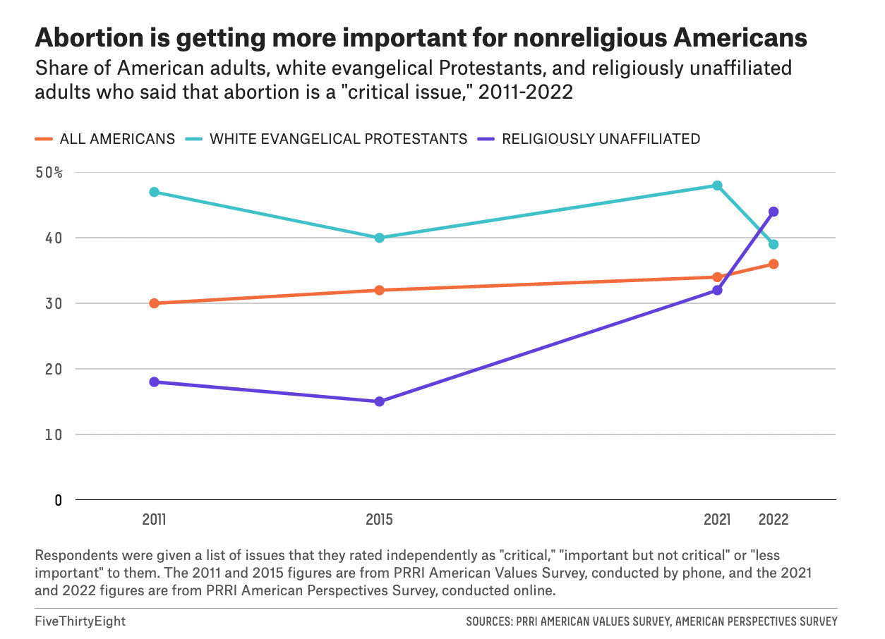 This is interesting: FiveThirtyEight reports that nonreligious Americans increasingly care about abortion rights—at this point more so than white evangelicals. From political scientist David Campbell at the University of Notre Dames: