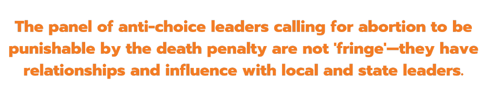 Jessica wrote yesterday about the all-male panel of anti-abortion religious leaders who met in Georgia over the weekend to discuss political strategies towards fetal personhood, which included calling for the death penalty for those who obtain abortions. It’s important to point out that this group is not fringe—men on this panel work with Republican state legislators across the country to write anti-abortion legislation, and the organizations they represent have relationships with local politicians and state leaders. These groups say the quiet part behind anti-abortion measures out loud: during the panel discussion the moderator (Baptist pastor Derin Stidd) asked, “Why do you all hate women?” The men laughed in response.