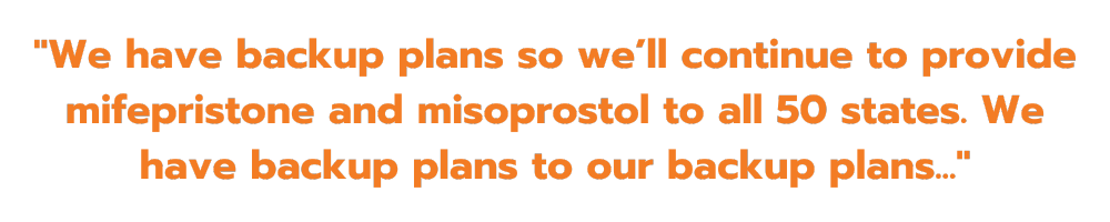 “We have backup plans so we’ll continue to provide mifepristone and misoprostol to all 50 states. We have backup plans to our backup plans, so that will continue to happen.”