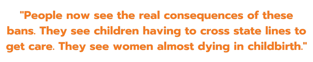 “People now see the real consequences of these bans. They see children having to cross state lines to get care. They see women almost dying in childbirth. So they don’t buy the arguments the other side is making.”