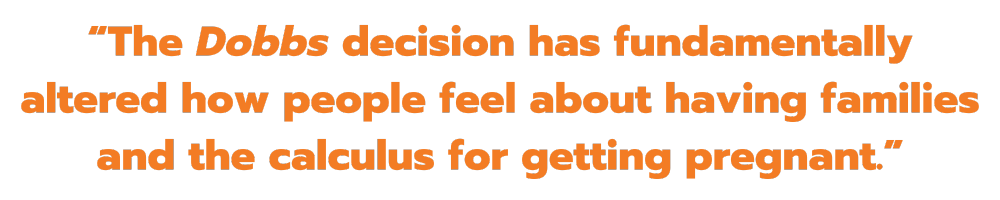 “The consistency between red and blue states suggests that the statistics on maternal mortality and the stories and struggles of women navigating the new normal on abortion access have penetrated the psyche of young people everywhere. The Dobbs decision, it seems, has fundamentally altered how people feel about having families and the calculus for getting pregnant.”