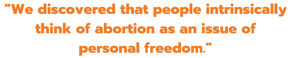 “We discovered that people intrinsically think of abortion as an issue of personal freedom,” she said. The other issue, of course, is that ‘choice’ isn’t really a thing if you live in a state where abortion is restricted or banned. “For us, it’s understanding that you don’t have a choice if you can’t exercise it,” Vasquez-Giroux said.