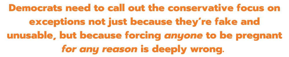 That’s why it’s so important that Democrats call out the conservative focus on exceptions loudly and often: Not just because they’re fake and unusable, but because if they don’t, they’re ceding perhaps our most important abortion rights message and value: Forcing anyone to be pregnant for any reason is deeply wrong.