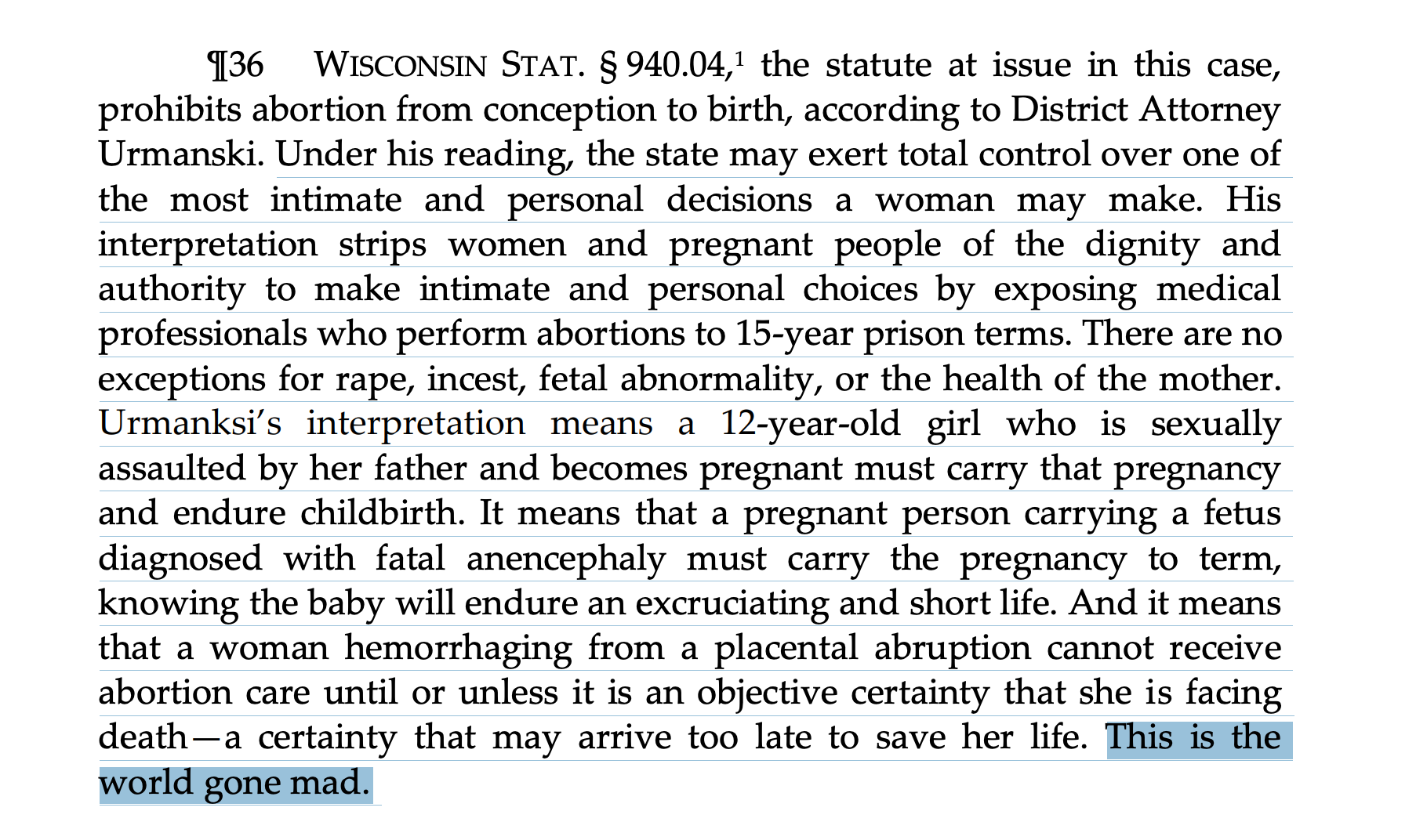 Before you go, a not-so-fun fact: Before Justice Susan Crawford was elected to the bench, her Republican opponent Brad Schimel claimed that the female justices were too “emotional” to rule on abortion. Seriously, when reacting to oral arguments in the abortion case, Schimel said that the women were on “on the brink of losing it,” and that you “could hear it in the tone of their voice.” I’m curious about how ‘emotional’ Schimel got when he lost. :)