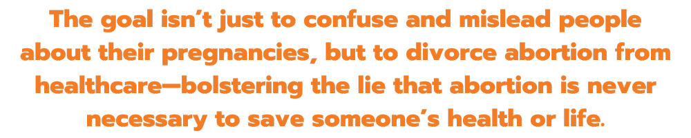 The goal isn’t just to confuse and mislead people about their pregnancies, but to divorce abortion from healthcare—bolstering the lie that abortion is never necessary to save someone’s health or life.