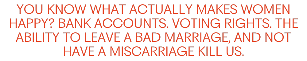 But you know what actually makes women happy? Bank accounts. Voting rights. The ability to leave a bad marriage, and not have a miscarriage kill us.