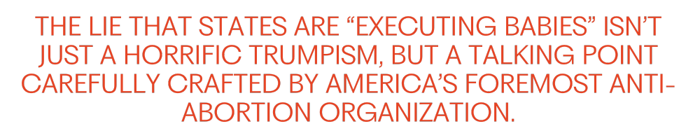 That includes Trump’s most malignant abortion claim: that states allow “post-birth” abortions. That’s right, the lie that states are “executing babies” isn’t just another horrific Trumpism, but a talking point carefully crafted by America’s foremost anti-abortion organization.