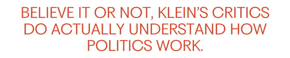 Believe it or not, Klein’s critics—from Planned Parenthood to yours truly—do actually understand how politics works. And while it’s true that women are tired of watching their humanity be treated like a political trading card, that’s not the urgent issue here.