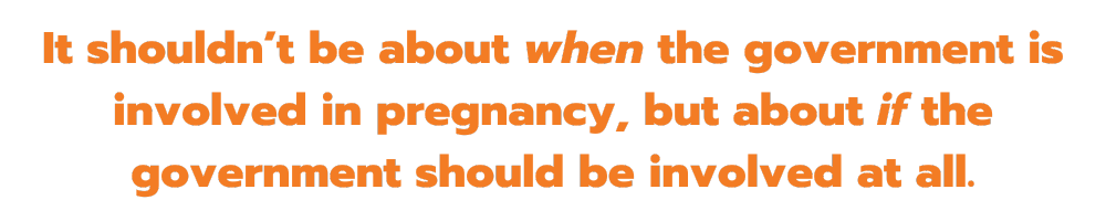 At the very most, we must think differently about how we’re framing the question. It shouldn’t be about when the government is involved in pregnancy, but about if the government should be involved at all. When we ask this question, we start to see a much different response.