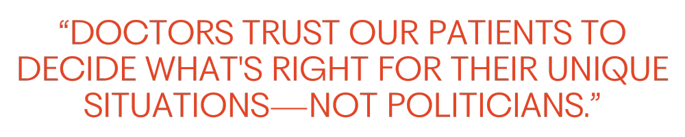 “Doctors trust our patients to decide what's right for their unique situations — not politicians. We know that decisions around pregnancy, including abortion, birth control, and miscarriage care, are deeply personal and private, and should be made by patients with advice from their trusted physicians and families. There's no room for political interference in our exam rooms.”