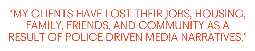 “My clients have lost their jobs, housing, family, friends, and community as a result of police-driven media narratives. Their lives have been turned upside down because of inflammatory stigmatizing reporting.”