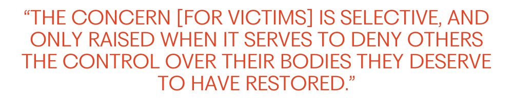 “To my knowledge, no anti-abortion advocate or policymaker responded to these realities by raising concerns about how their actions were impacting the safety and wellbeing of these victims. The concern is selective, and only raised when it serves to deny others the control over their bodies they deserve to have restored.”