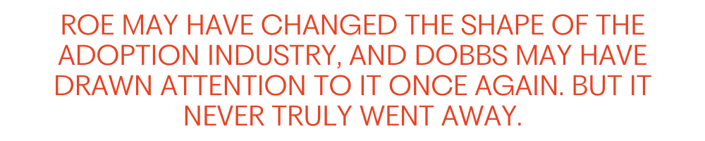 The legacy of maternity homes is clear in story after story that I have heard from mothers who have relinquished infants for private adoption, who have been impacted by a predatory, anti-abortion industry that targets vulnerable and poor pregnant people in order to commodify their children. Roe may have changed the shape of the industry—and Dobbs may have drawn attention to it once again—but it never truly went away.