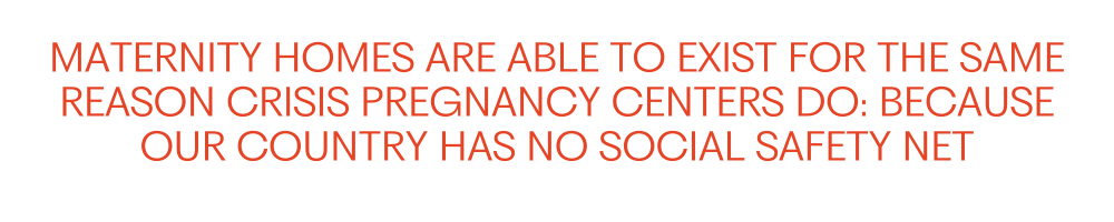 In other words, maternity homes are best understood as residential crisis pregnancy centers. They are able to exist for the same reason CPCs do: because our country has no social safety net. In the same way pregnant women will go to CPCs because they need pregnancy tests or free diapers, they go to maternity homes because they need housing.