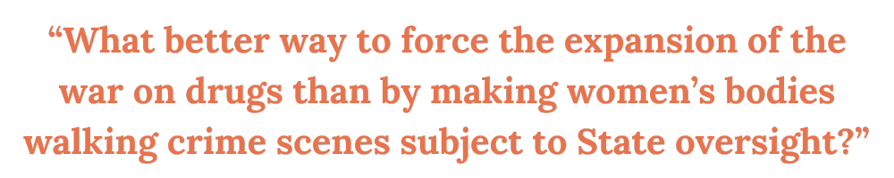 By placing mife and miso on the controlled substances list, pregnant people are put in the horrible position of having to choose between relying on their family, friends, and providers—or isolating themselves from them out of fear of exposing their loved ones and healthcare providers to criminal penalties. What better way to force the expansion of the war on drugs than by making women’s bodies walking crime scenes subject to State oversight?