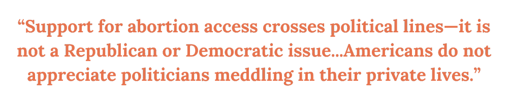 “We’ve learned many lessons from each one, but a few stand out. First, support for abortion access crosses political lines—it is not a Republican or Democratic issue. Second, Americans do not appreciate politicians meddling in their private lives. And finally, when abortion rights are under real threat, voters show up to defend them. This year will be no different.”