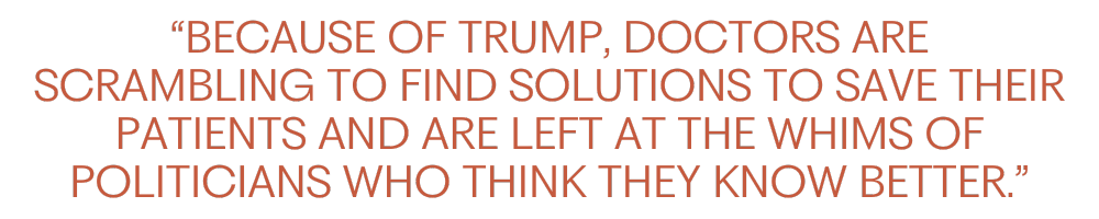 “Because of the abortion ban in my state, doctors could not induce labor, leaving me at far greater risk of infection and hemorrhage. [Trump] has comprehensive plans to ban abortion nationwide, which could inflict the kind of pain that I went through on women in all 50 states.”