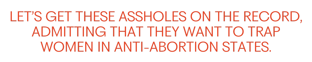 Republicans have had their eye on travel restrictions to stop women from getting abortions, but their attacks are largely flying under the radar. Democrats should introduce legislation to protect the right to travel, regardless of pregnancy status. Let’s get these assholes on the record admitting that they want to trap women in anti-abortion states.
