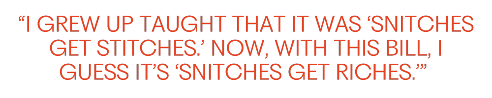 “I grew up taught that it was ‘snitches get stitches.’ Now, with this bill, I guess it’s ‘snitches get riches,’” she said.