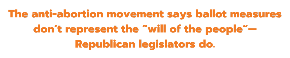 It’s no secret why anti-abortion lawmakers and activists are so eager to define the “will of the people” this way. Every time abortion rights is put directly to voters, abortion rights wins. It’s much better for Republicans to focus on elected representatives as the true voice of voters—especially as they gerrymander states to hell and back and engage in voter suppression and disenfranchisement. Anything to pretend as if these bans are something Americans want.