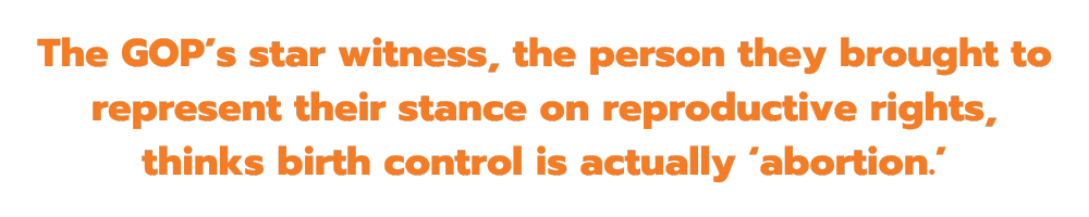 As AED noted this week, this is a really big deal: The GOP’s star witness, the person they brought to represent their stance on reproductive rights, thinks birth control is actually ‘abortion.’ For anyone who thinks connecting Francis’ views to those of Republicans is a reach, consider this: Mere days later, GOP lawmakers refused to support the Right to Contraception Act. Instead, they offered their own bill—legislation that excluded emergency contraception from protections because, they said, the medication “ended” a pregnancy.