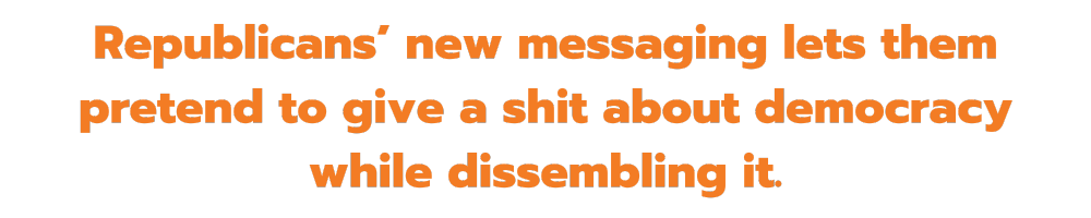 Obviously, it is deeply hypocritical (and infuriating) for Republicans to applaud democracy and states’ rights in a moment when they’re doing everything possible to stop voters in those states from having a say. But that’s what makes this messaging so important to them: They can pretend to give a shit about democracy while they dissemble it.