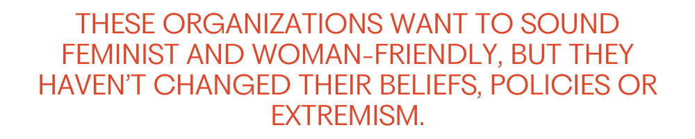 Don’t get me wrong, plenty of them still call women killers, but that’s not where the mainstream groups are anymore. At least, not publicly. These organizations may be working hard to sound feminist and woman-friendly, but they haven’t changed their beliefs, policies or extremism. They’ve simply dressed it up nicer.