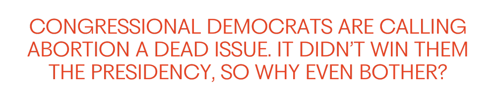 Conservatives had fifty years to write their post-Roe wishlist, and they haven’t taken a beat or breath while barreling their way through it. But here’s what’s keeping me up at night: As we speed towards a future where women aren’t full citizens, a source tells me that some Congressional Democrats are calling abortion a dead issue. It didn’t win them the presidency, so why even bother?