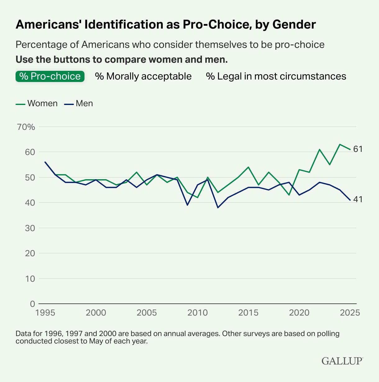 One positive development is what’s happening with Democratic men: Gallup reports that in 2020-2021, 66% identified as pro-choice. By 2022–2025, that number had spiked to 85%. So I’m going to hold onto that increase with my last remaining shred of optimism. ¯\_(ツ)_/¯